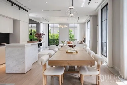 这座位于 Yan Nawa, Bangkok 的独栋别墅出售,提供4卧室6卫浴,使用面积约648平方米。土地面积为57平方哇(约228平方米,约0.14莱)。室内为通透明亮的开放式布局,大幅落地窗配轻盈纱帘,客厅设大型转角沙发、圆形茶几与现代吊灯;相连餐区配长木餐桌与软包座椅。厨房以大理石中岛与简洁柜体营造精致质感,黑色窗框引入绿意景观,石质地面通铺全屋。