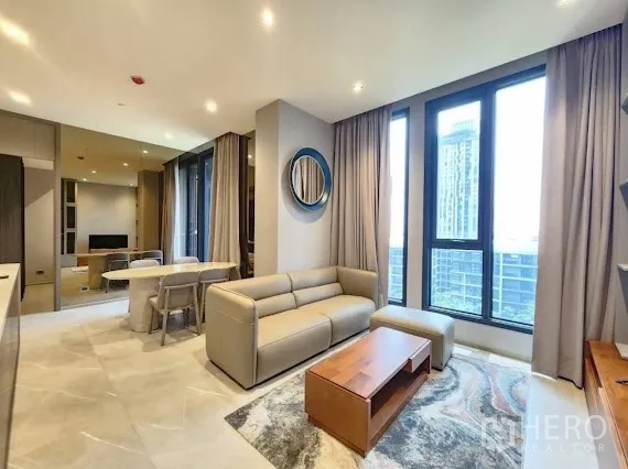 这套位于曼谷Watthana区的高端公寓出租,坐拥Thonglor核心区,距BTS Thong Lo站约250米。8层角落单位,2卧2卫,使用面积约77平方米(约19.25平方哇,约0.048莱)。室内设有现代化厨房,长形中岛台、内置灶台与烤箱、高柜以及不锈钢双开门冰箱,适合日常烹饪与招待来宾。单位配齐全套家具,视野通透无遮挡,营造静谧雅致的城市居住体验。